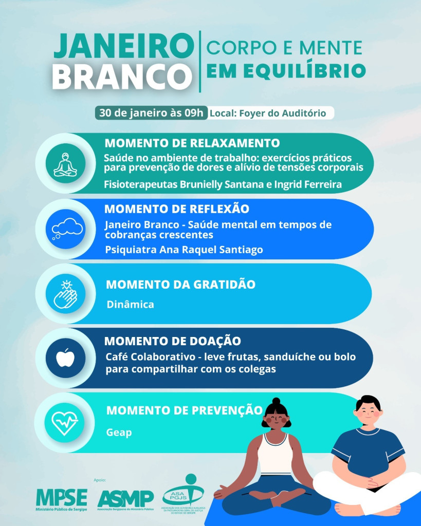 A atuação do SINDSEMP na Comissão de Prevenção de Riscos à Saúde Mental do Ministério Público de Sergipe tem sido decisiva para ampliar o debate e as ações voltadas ao cuidado com a saúde emocional de servidores e servidoras. Como parte desse trabalho contínuo, será realizado nesta sexta, dia 30, às 9h, no foyer do auditório do MPSE, um evento em alusão à campanha Janeiro Branco, que reforça a importância da saúde mental no ambiente de trabalho.
